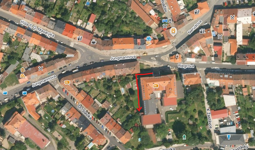 vchod je po pravé straně budovy školy, v 1. patře, viz mapka